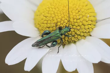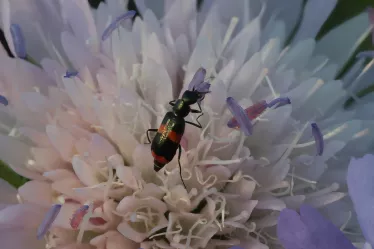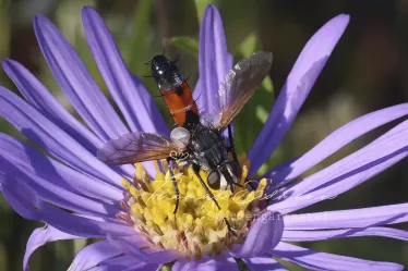 Eine besonders hübsche Fliege ist die Kohlwanzenfliege. Hier auf einer Aster amellus Sorte entdeckt. Ihr Name rührt daher, dass sie ihre Eier an Wanzen ablegt. Die Larven befallen diese. Der Gebänderte Warzenkäfer ist ebenfalls ein Nützling im Garten. Er jagt kleine Insekten und Milben. Lebensraum findet er für sich und seine Larven im Komposthaufen und in rottendem Totholz.