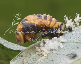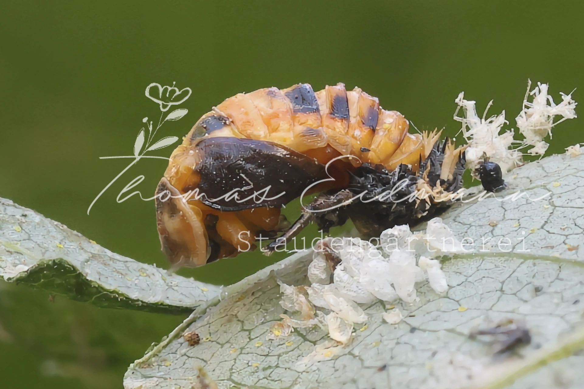 Stauden bieten nicht nur Nektar. Auch die Blätter dienen als Nahrung und Kinderstube. Wi groß ist die Freude, wenn wir Spuren der Blattscheiderbiene an unseren Pfingstrosenblättern finden. Eine Emotion, die es vor 20 Jahren noch nicht gegeben hätte. Wir merken, es findet ein Umdenken statt. Und dennoch: Blattläuse z.B. sind immernoch sehr unbeliebt beim Hobbygärtner. Doch auch hier darf man nicht vergessen, dass es sich bei den Läusen ebenfalls um wichtige Insekten handeln. Also lieber zweimal nachgedacht, bevor das Blattlausmittel zum Einsatz kommt. Die Marienkäfer wissen ganz genau, wann die Blattlausaison beginnt. Schlüpfen die kleinen hungrigen Larven, erwartet sie schon ein reich gedeckter Blattlaustisch. Wir kultivieren unsere private Marienkäferlarvenkolonie an unserem Hopfen, der über das Scheunendach rankt. Nach ein paar Wochen ist der Blattlausspuk dann auch vorbei und unsere Staude im Garten sieht - oh wunder - wieder so schön aus wie eh und je.