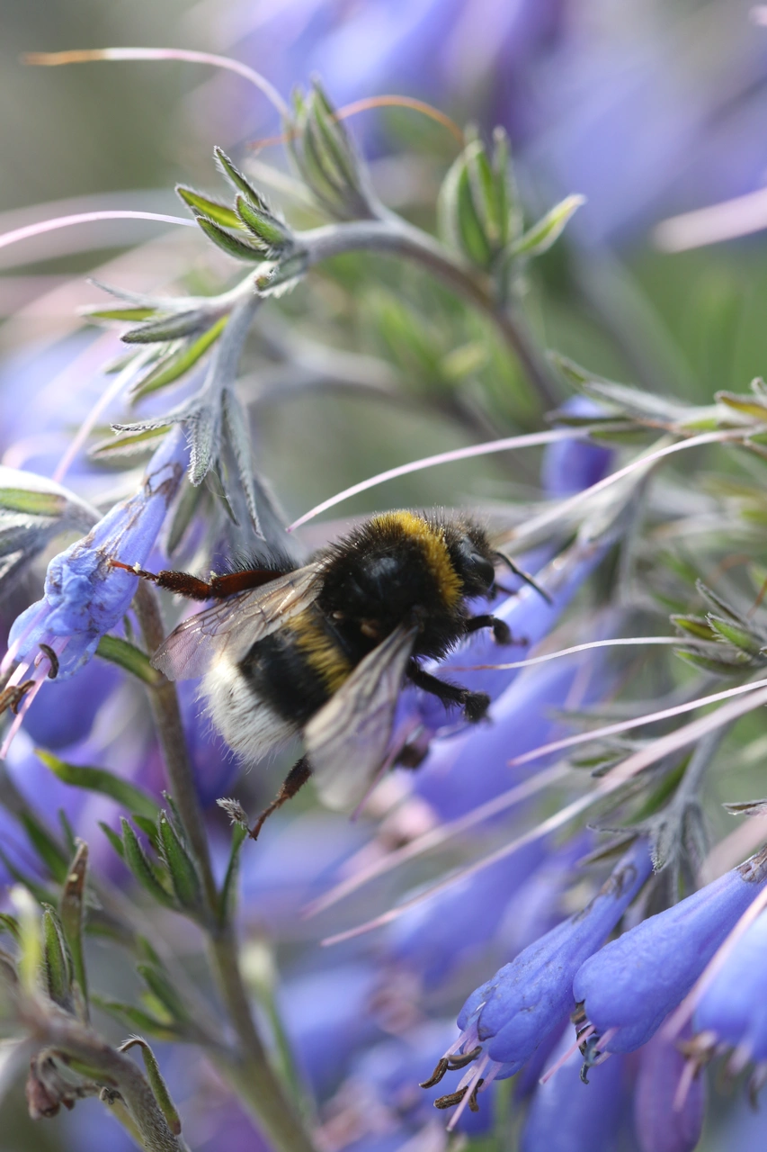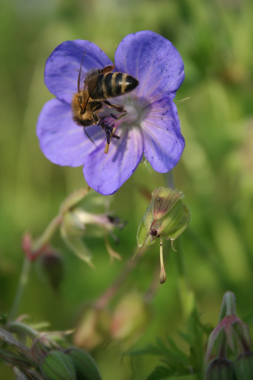 Klassiker sind hier Stauden aus der Familie der Lippenblütler. Auch Rosengewächse sind sehr beliebt. Dazu zählen auch die Strochschnäbel, wie der Blutstorchschnabel – Geranium sanguineum oder der Wiesenstorchschnabel – Geranium pratense. Borretschgewächse sind ebenfalls verlässliche Nektarspender. Viele sind vor allem auf kleinere Insektenarten ausgerichtet. Der großen Steinhummel ist das herzlich egal. Ist die Blüte zu klein, wird kurzerhand am Blütengrund ein Loch gebohrt.