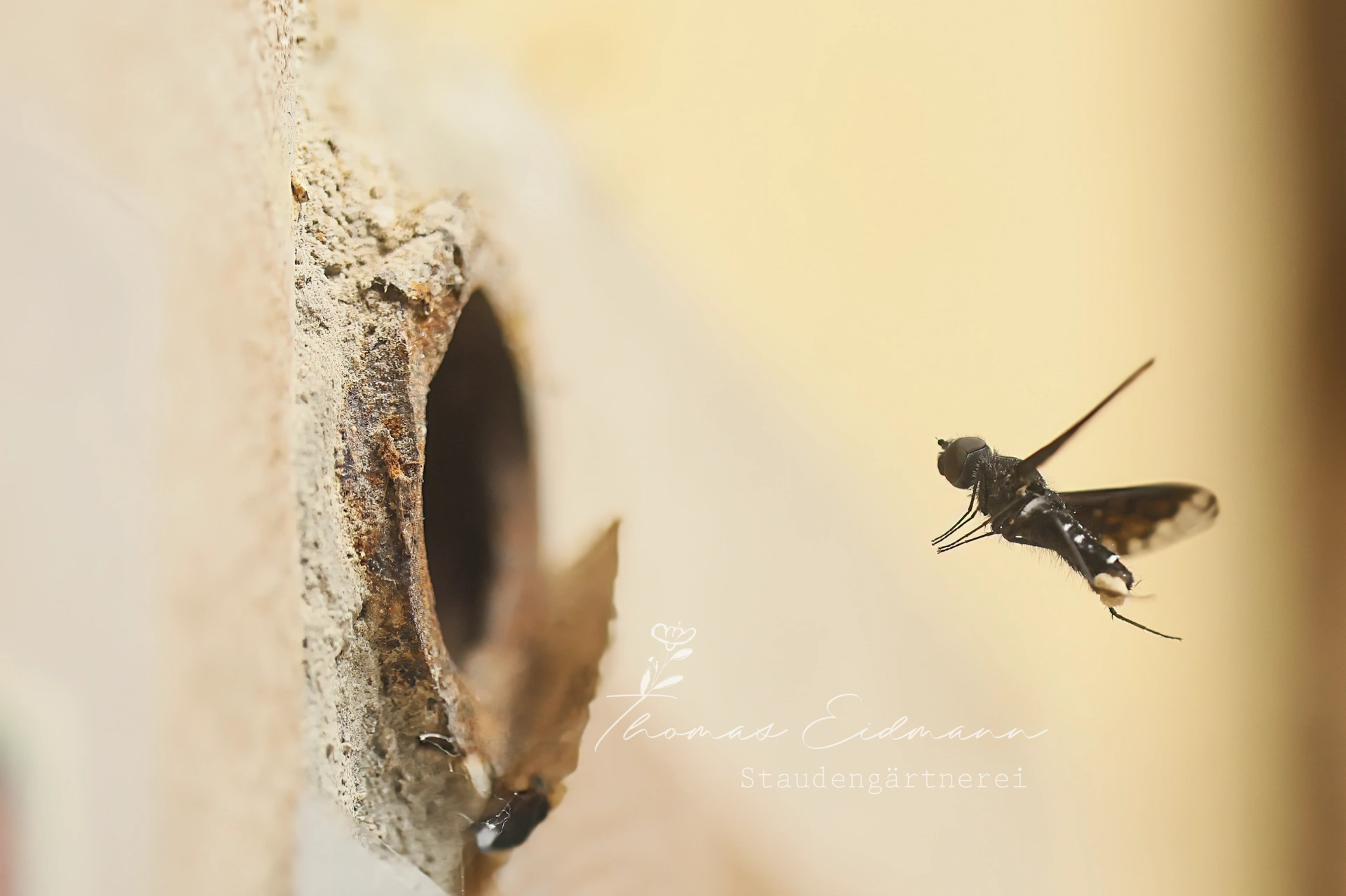 Nahrung alleine reicht, wie Sie sicher wissen nicht aus, um Insekten im Garten zu etablieren. Ein Insektenhotel ist eine schöne Sache, doch beobachten Sie einmal, wo in ihrem Garten Insekten überall ein zu Hause finden können. Sie werden überrascht sein. Die Beständigkeit im Garten ist dabei fast genauso wichtig, wie die Angebote, die Sie schaffen. Bei uns hat sich eine Blattscheiderbiene eine Bruthöhle in einen kleinen alten Dachwurz-Trog an der Haustüre gebaut.