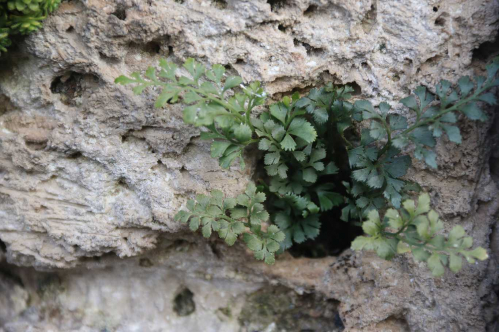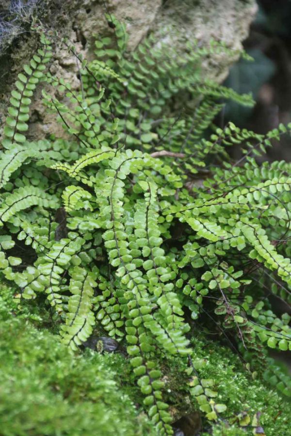 Asplenium ruta-muraria und Asplenium trichomannes sind zwei weitere beliebte Zwergfarne, die wir in absonnigen bis schattigen Mauern finden. Besonders der Streifenfarn kann sehr schattige erdfeuchte Gesteinsfugen besiedeln. Beste Pflanzzeit für diese Mauerfugen ist das frühe Frühjahr.