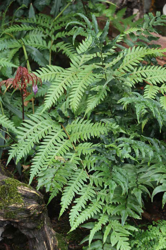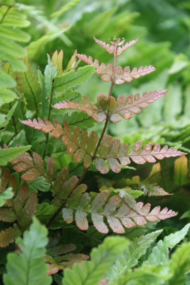 Ebenso ist der Rotschleierfarn der beim Austrieb mit seinen bronzerot getönten Wedeln auffällt. Besonders geeignet für „warmen Schatten“ in sommerlichen Sitzecken.