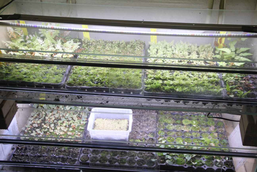 Diese kleinen Zwergfarne, etwa wie der Schriftfarn, die Mauerraute und der Streifenfarn, haben es uns besonders angetan. Hier werden wir in den nächsten Jahren unser Sortiment noch erweitern. Weil diese meist noch wenig zu erhaltende Raritäten sind haben wir uns eine kleine Farnvermehrung unter Kunstlicht im Keller gebaut.