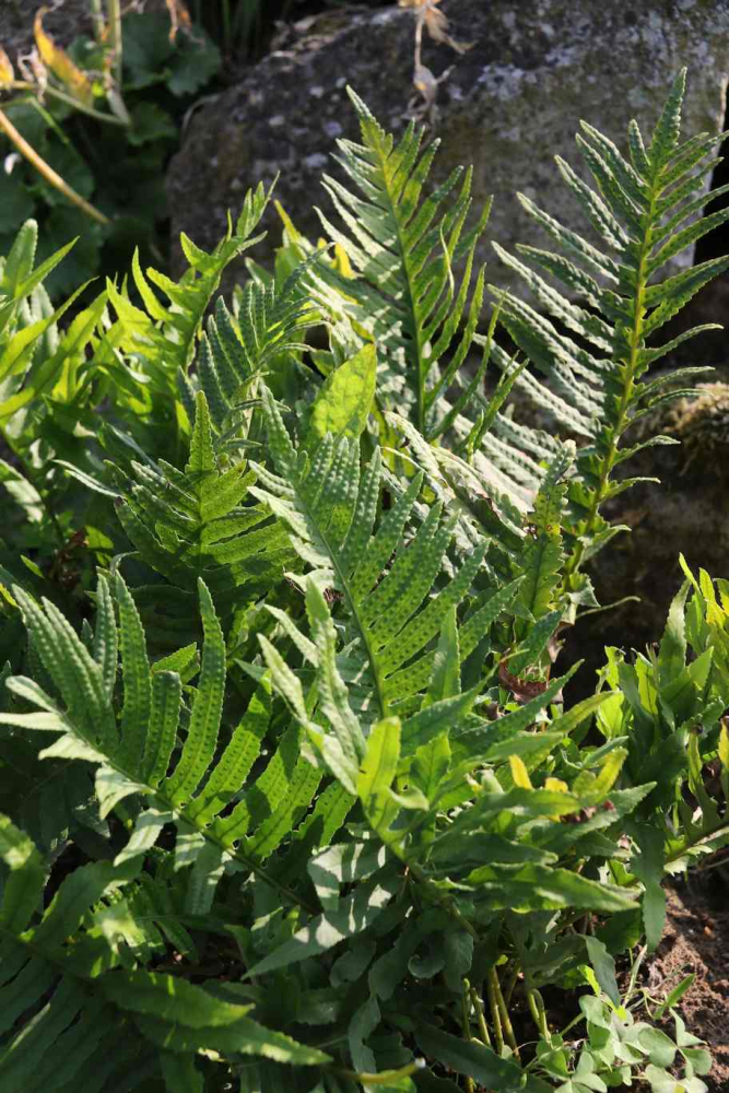 Immergrün ist auch Polypodium vulgare. Er ist ein wahrer Alleskönner. Auch wenn er recht langsam wächst, sich kaum aussät und mit seinen kurzen Rhizomen nur wenig Zuwachs im Jahr bringt, so kann er doch ohne konkurrierenden Nachbarn alle möglichen Stellen besiedeln. Vom einfachen Bodendecker im trockenschattigen Beet bis hin zur sauren Humusauflage auf purem Sandstein oder auch in sattem Kalk. Er verträgt tiefen Schatten und nimmt es durchaus auch mit sonnigen Plätzen auf.